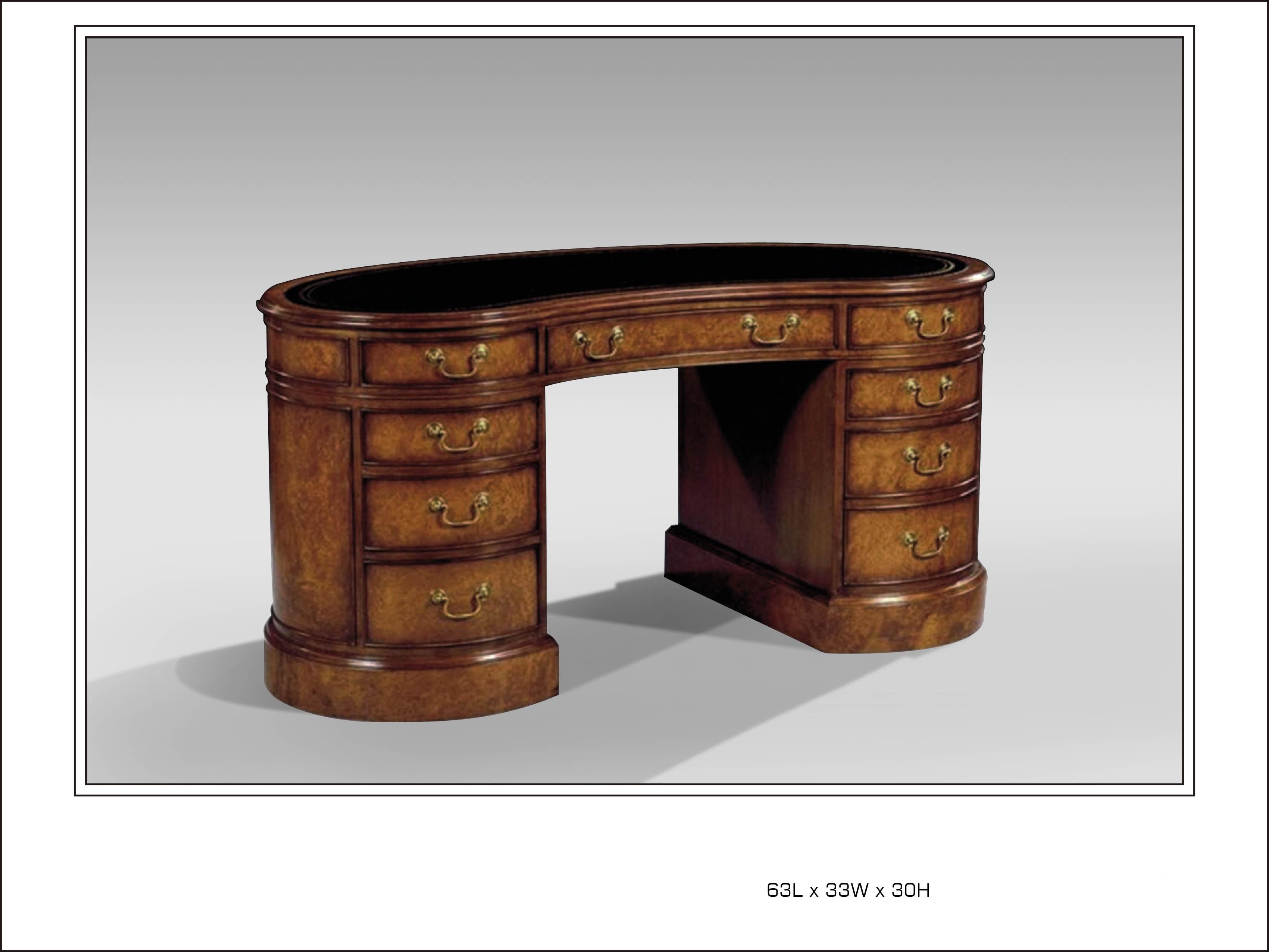 Kidney desk shown in Myrtle burl. Comes with two files drawers. Also available in mahogany. This desk is available in brown leather only.