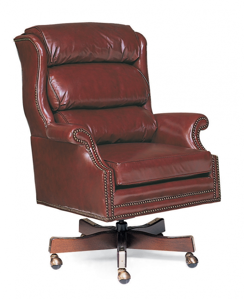 Traditional bustle back large scale executive wing chair. Available in various finishes and leathers.