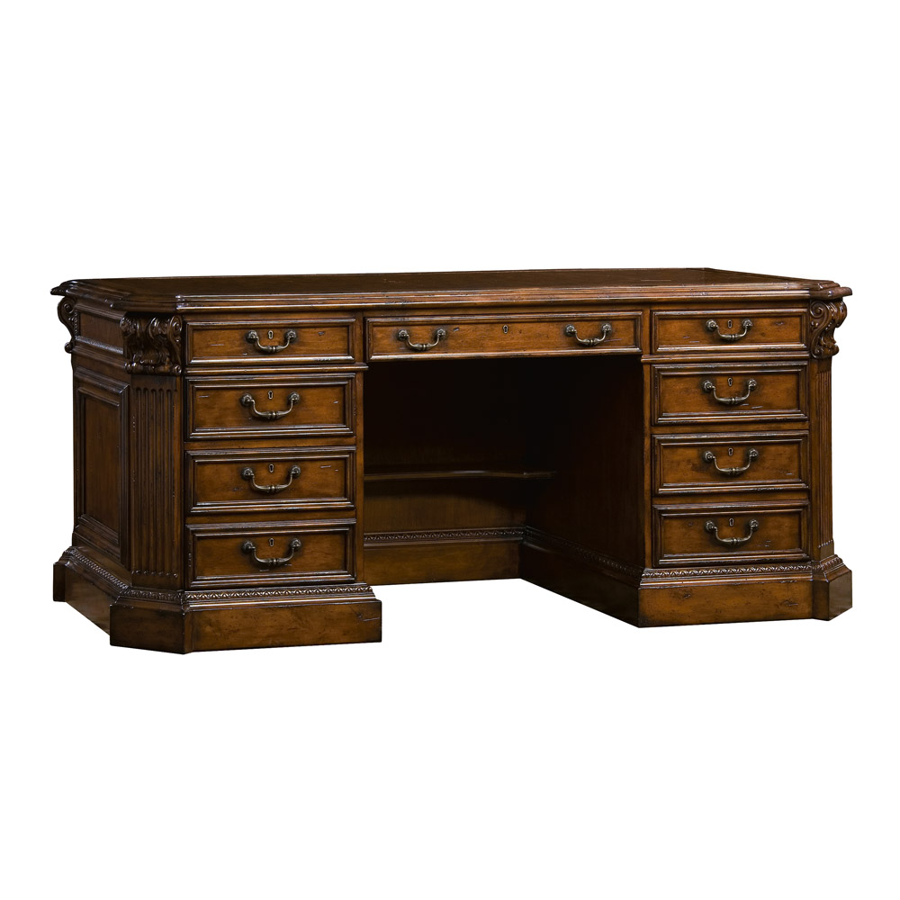 Executive desk with fluted columns, graceful carved acanthus leaves and antiqued pewter hardware. The architecturally styled deck features hand cast scrolled ironwork details over exquisite seeded glass doors. The pedestal desk is an impressive member of the Laredo home office collection featuring a wood framed dark brown leather top with antique brass-colored tooling and a flip down keyboard drawer with ergonomic wood palm rest. Each pedestal includes two box drawers and a letter/legal file drawer on ball bearing slides. Lockable left hand pedestal and cord management. Dimensions: Kneehole: 24 7/8"W x 25 1/8"H