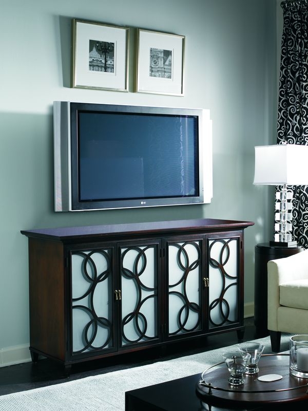 Stylized door fretwood and frosted glass highlight this very functional media cabinet. Adj. wood shelves behind doors. W60 D19 H32