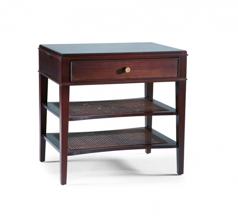 This tiered table is finished on all sides. It provides 6 1/2" storage between surfaces and has inset cane on shelves.