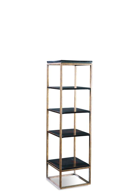 Four fixed shelves and top in a rich chocolate brown rubbed-through finish on bronze textured finished solid wrought iron. W18 D18 H65