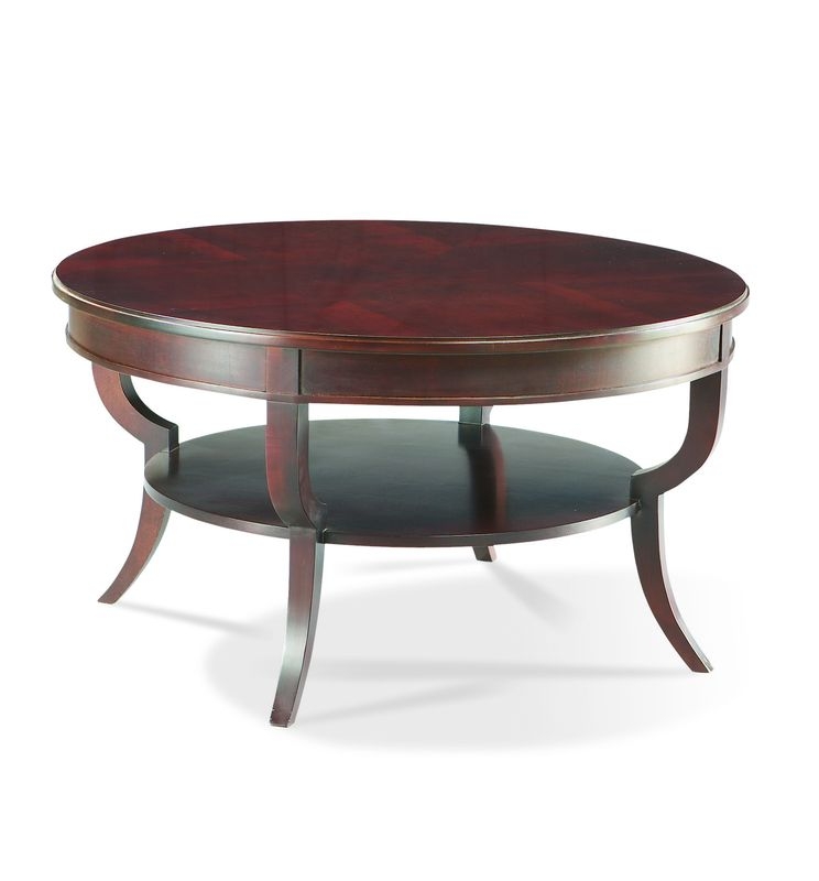 Great scale round cocktail table with a useful mid-shelf. The legs are a contemporary shaped tapered design.