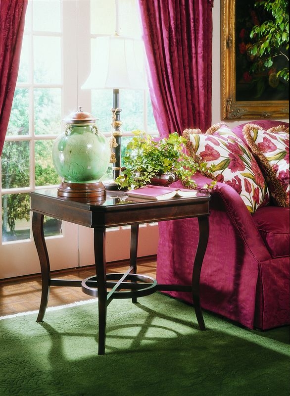 Well scaled square lamp table with chamfered corners and a handsome x-stretcher intersecting a framed circle.