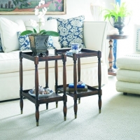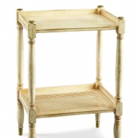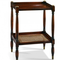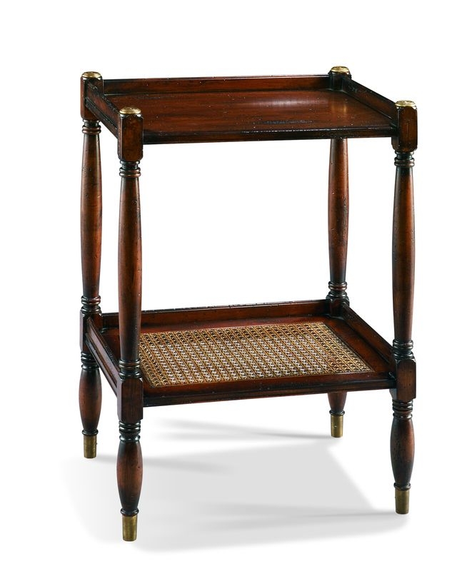 Very functional and sturdy small chairside table with inset caned lower shelf, brass ferruled feet and post accents.