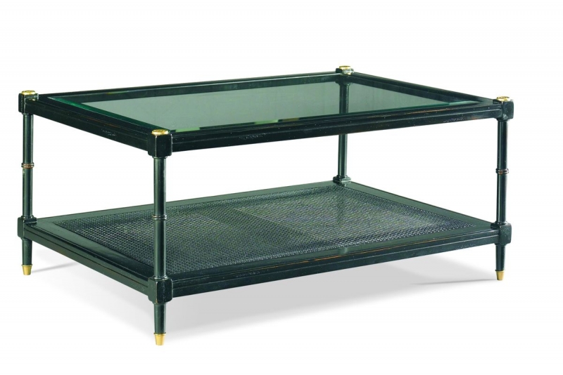 Style and simplicity join together in this island inspired rectangular cocktail table with lower cane shelf and beveled glass top. Brass turned post caps and leg ferrules.