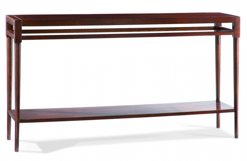 Generously sized sofa table/console but with light scaling. Rectangular with tapered round legs.