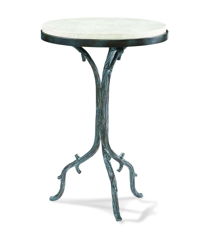 Unique chairside table taken from a rural twig table design. Forged iron with a verdi bronze finish and a stone top.