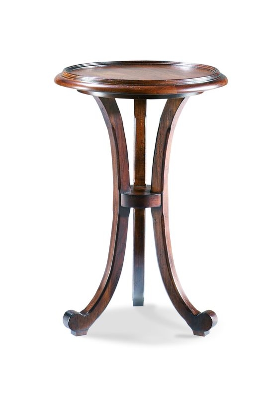 Casual round chairside table or drink stand with a shaped molding gallery rail surrounding the pecan veneered top.