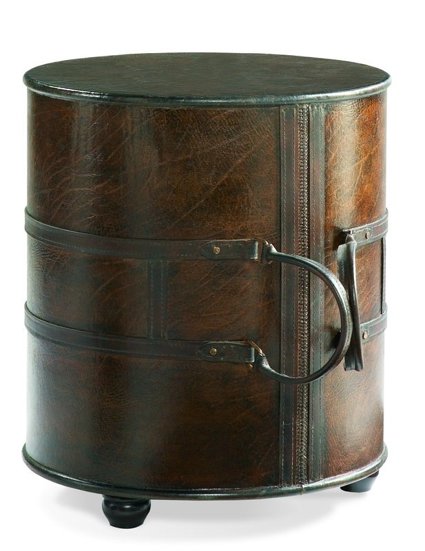 A casual chairside table created in the form of a duffel bag made of faux leather with leather straps and handles.