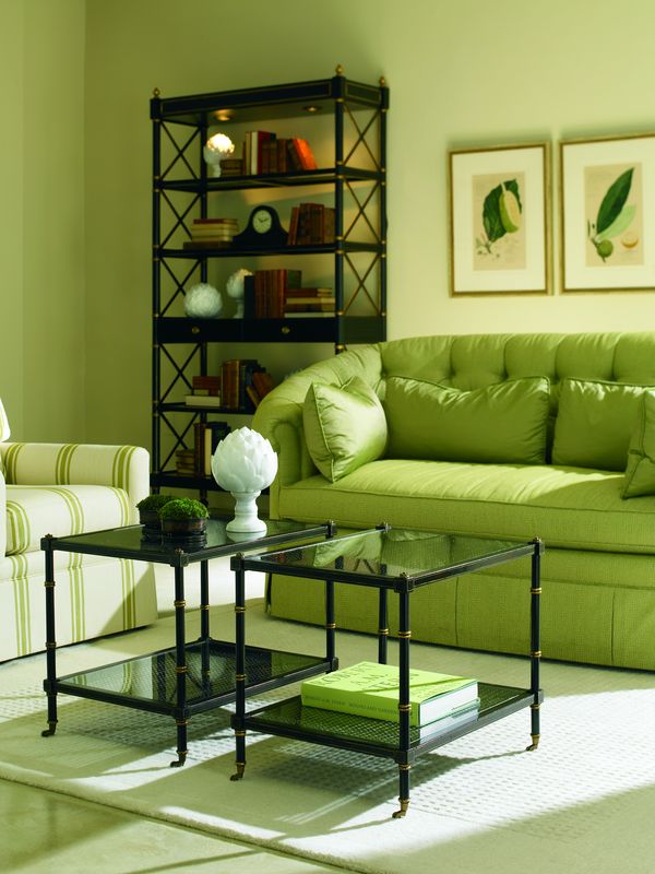 English regency designed accent table with bamboo turned legs and cane under glass surfaces. Can be used individually or in multiples. Antique red with aged gold accents.