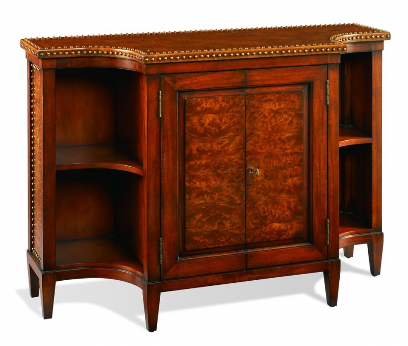 Console/bookcase featuring highly figured oak burl veneer door fronts as well as antique brown leather top and side panels with antique brass nailhead trim.