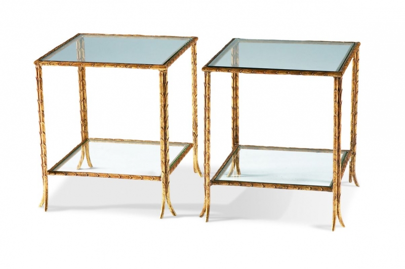 Textured wrought iron in an antique gold finish with set in clear glass top and lower shelf.