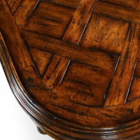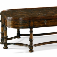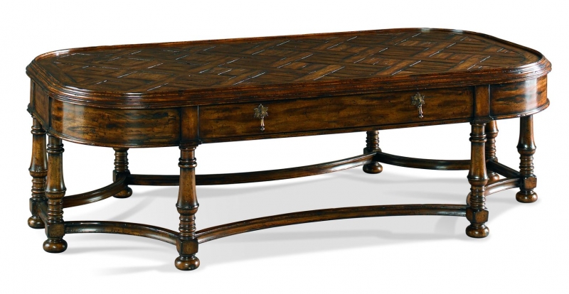 Overscaled rectangular drawer cocktail table with rounded corners, eight turned legs and a handsome shaped stretcher. Heavily antiqued scribed top to look like original inlay work.