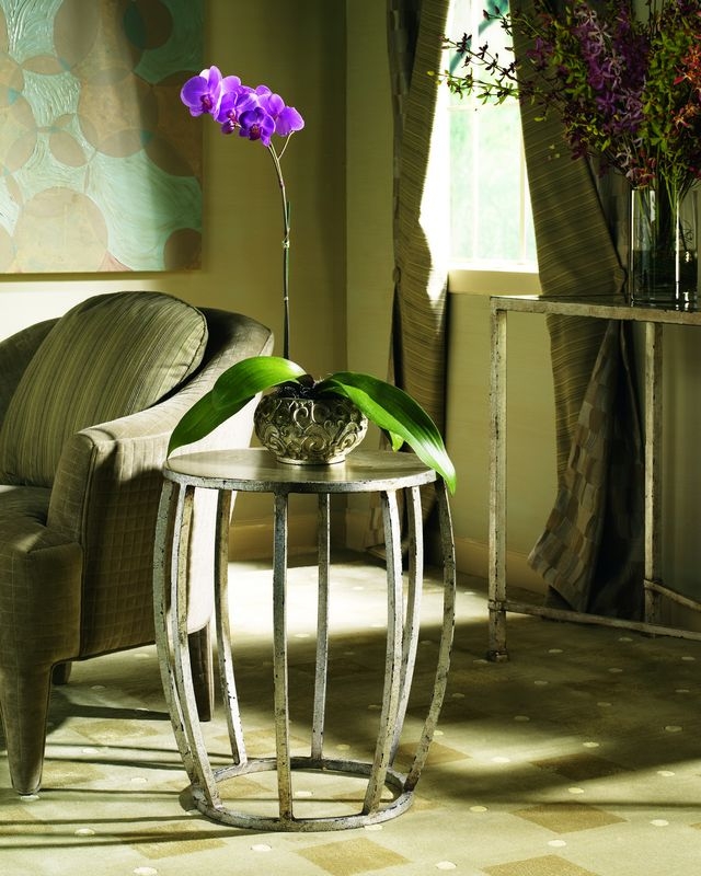 Round all steel drum table with 20" diameter top. Heavily distressed antique gold finish with pewter highlights.