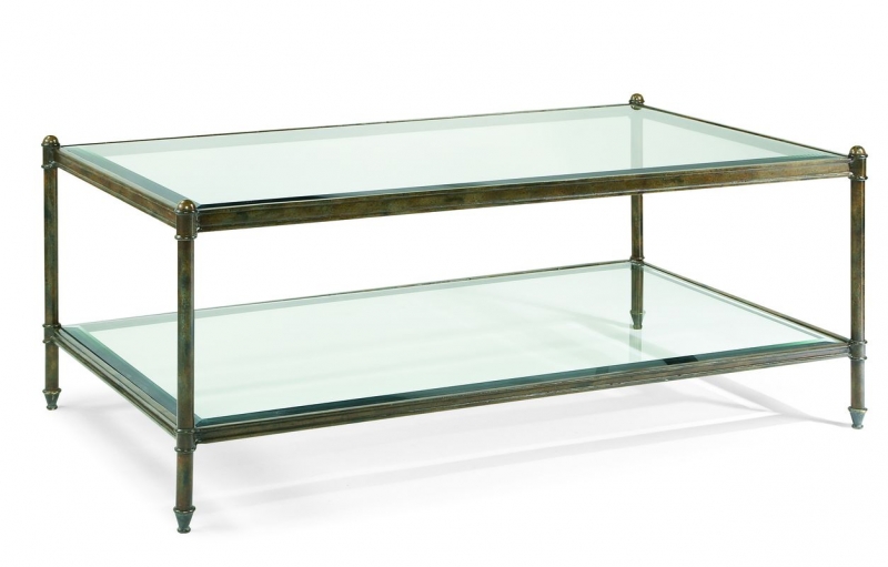 Large scaled rectangular cocktail table with two inset beveled glass panels. The finish is a mottled antique bronze.