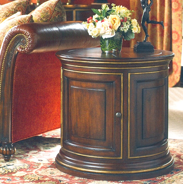 Large drum table in a dark walnut finish with burnished gold highlights. One interior shelf.
