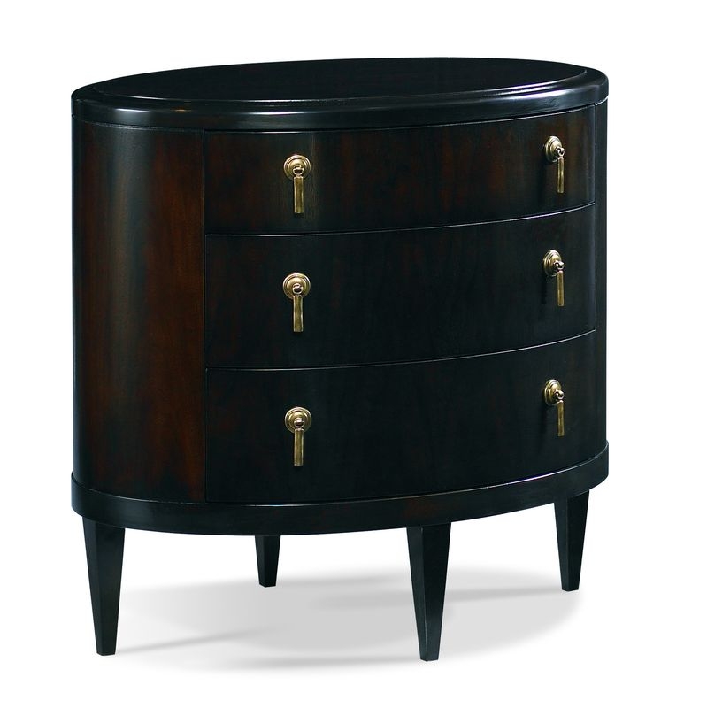 Oval bedside table with three drawers. 29 1/4W x 20 1/4D x 28H.
