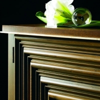 Four adjustable wood shelves, two tray drawers with one silver liner and one liner pad, wine rack, pull-out tray. Choice of Nickel or Bronze hardware.