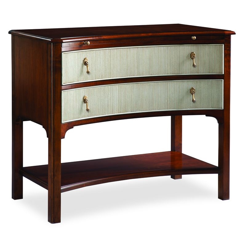 Two drawers, pull-out tray, brass pendants, small brass knobs.