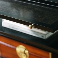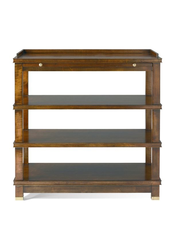 One pull-out tray with copper surface, three stationary wood shelves.