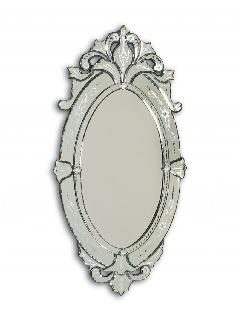 Hand cut and etched shaped Venetian glass mirror frame. Beveled mirror.