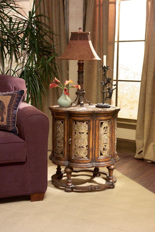 Made of select solid woods and wood products. Open fret work with resin panels on top and sides. Single door opens for storage. Antique brass finished hardware.