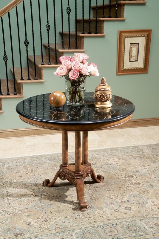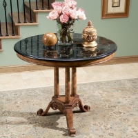 Made of select wood products and resin components. Fossil stone veneer top with brass design inlay.