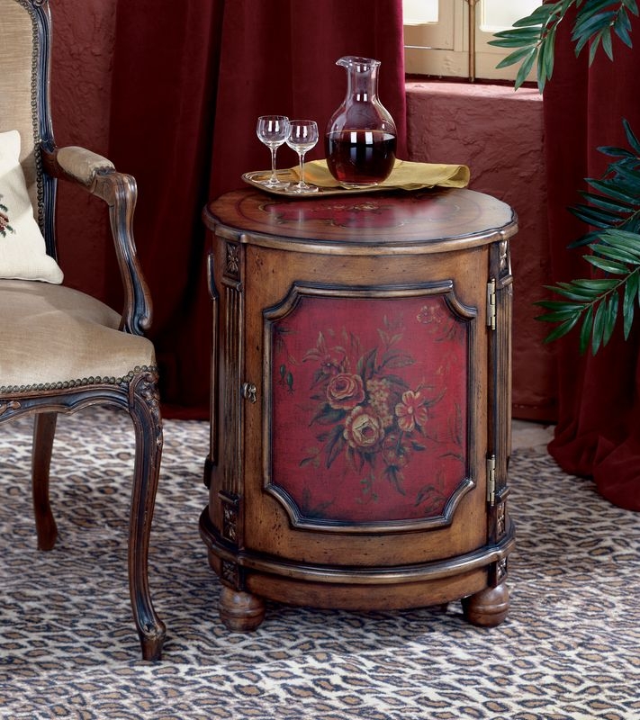 Unique hand painted floral design on selected hardwoods, wood products and resin components. Working door with antique brass finished knob.