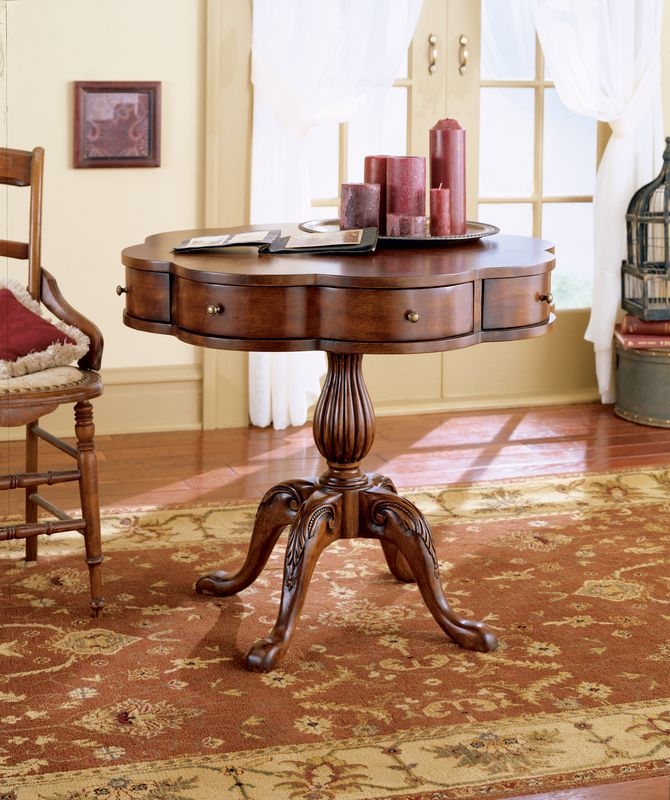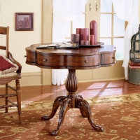 Selected hardwoods and choice veneers. Hand carved details. Veneer inlay top with end grain border. Two working drawers. Antique brass finished hardware.