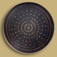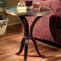 Unique hand painted design on select solid woods and wood products. Brass gallery around tabletop.