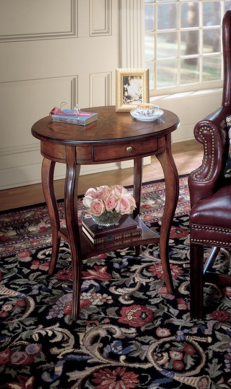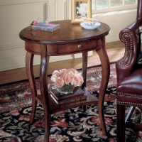 Made from selected solid wood and choice cherry veneers. Maple and walnut inlay. Unique design with burnished pattern lines. Delicately designed legs. Lower storage shelf. Working drawer. Brass plated hardware.