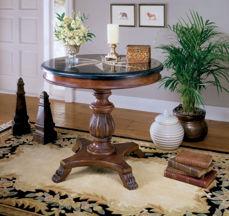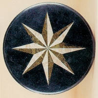Fossil stone veneer top with sunburst inlay. Hand carved resin appointments.