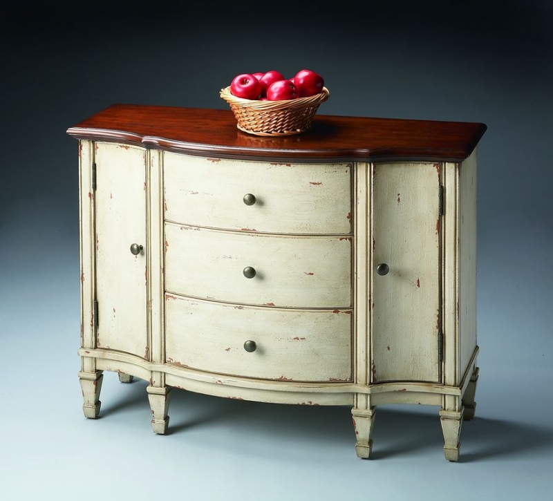 Hand painted finish on selected hardwoods and wood products. Choice cherry veneer top with an undulated surface cherry finish. Two side storage areas each with an adjustable shelf. Three drawers with dovetailed construction. Antique brass finished hardware.