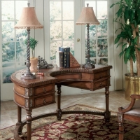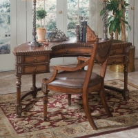 Selected solid wood, choice veneers and resin components. Hand carved details. Leather inserts on top. One center and four side drawers.