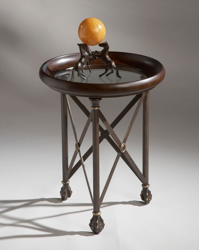 Finished metal and aluminum. Inset polished edge glass top in faux leather finished rim. Resin components.