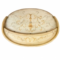 Unique hand painted design on selected hardwoods and wood products. One large drawer and three smaller drawers with antique brass finished hardware. All drawers are felt lined.