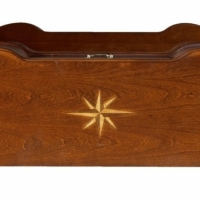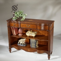 Selected solid woods and choice cherry veneers. Maple, walnut and cherry veneers inlay design on top and bottom front apron. Three drawers with antique brass finished hardware.
