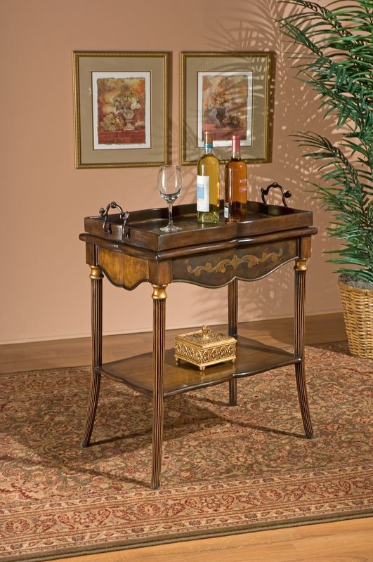 Selected solid woods and wood products. Resin legs. Etched brass front apron and tray surface. Removable tray has metal handles with black verdi finish.