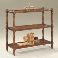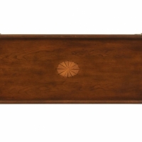 Crafted from selected hardwoods, and choice cherry veneers. Top shelf features a center linen fold inlay design of maple and walnut veneers surrounded by cathedral grain cherry veneer. Lower 2 shelves are cherry veneer.