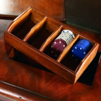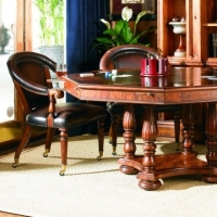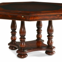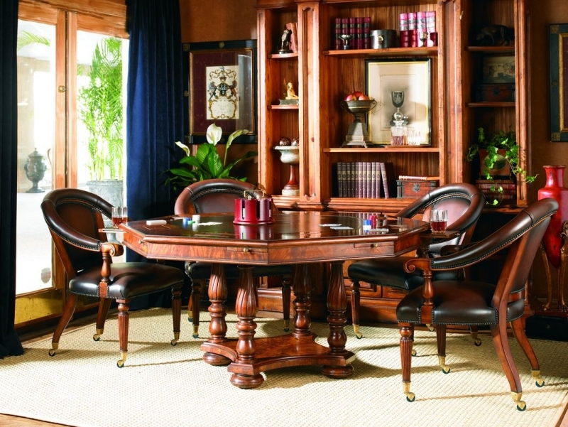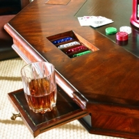 Large brown tooled leather-top poker/game table with a substantial four legged pedestal base. Six pull-out drink trays in top apron and six chip holders inset in leather top.
