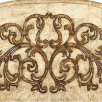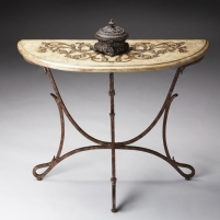 This demilune console has a bronze finished metal base with an acid-etched pastor stone top.