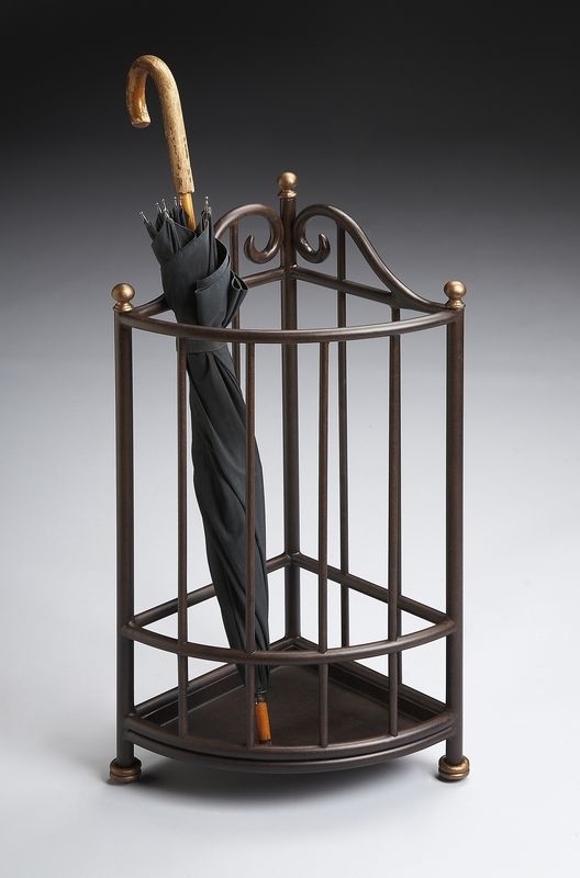 Finished metal with antique brass finished accents. Designed to fit into a corner.