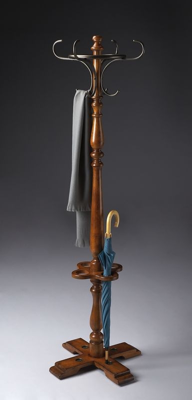 Selected solid woods, wood products and choice cherry veneers. Black finished metal coat hangers, center partition for umbrellas, and brass finished cups in base. Physically distressed finish.