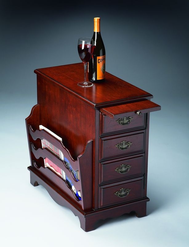 This attractive magazine table will satisfy your desire for both function and good looks. Crafted from select hardwood solids and wood products, it has a hand-rubbed cherry finish on choice cherry veneers. Featuring a magazine compartment on one side and a pull-out tray for a beverage or the remote control, the antique brass finished pulls open its door front to expose a generous storage compartment with one adjustable shelf.