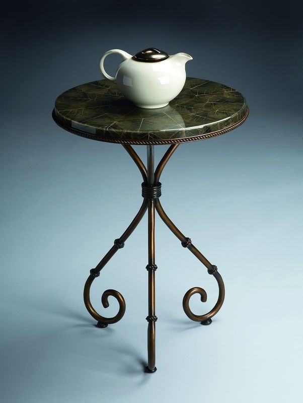 Wood products and finished wrought iron base. Top is laminated skeletonized leaves.