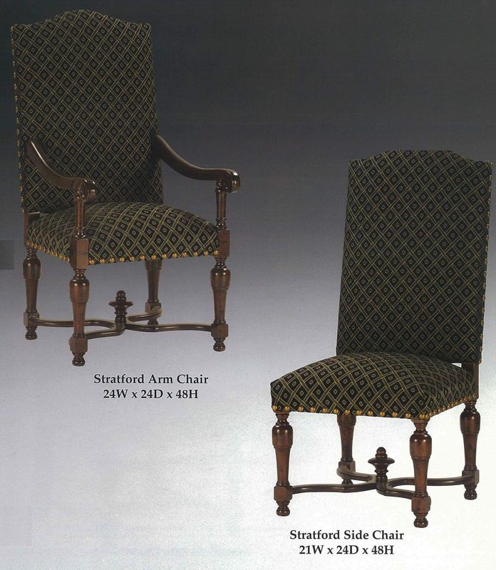 Stratford side chair available in numerous finishes and fabrics. Arm chair also available.