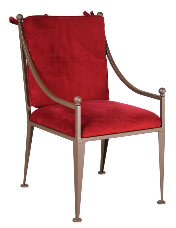 Metal Arm Chair with tie on cushions. Available in alll metal finishes. Side chair available.