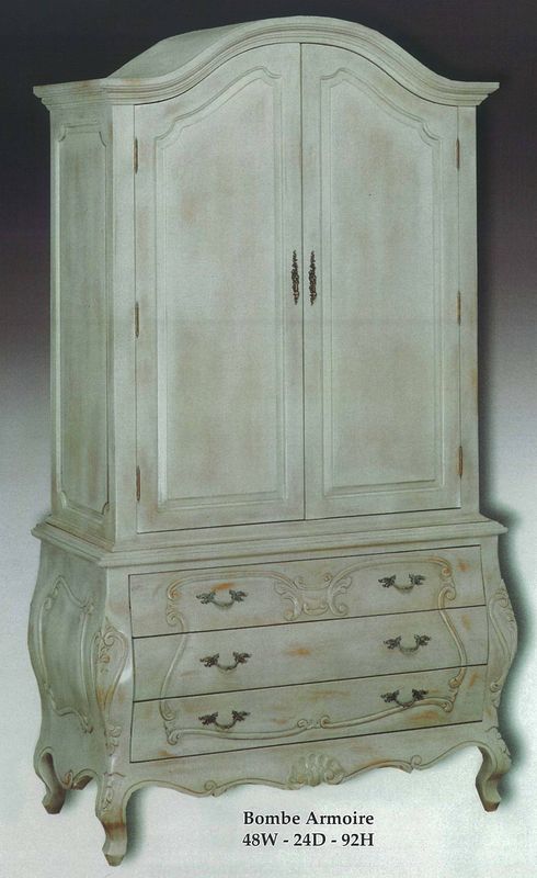 French provincial bombe in Alder wood. Available in numerous finishes. Interior can be customizable.