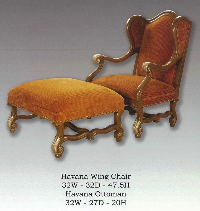 Havana wing chair available in various finishes and fabrics. Matching ottoman available.